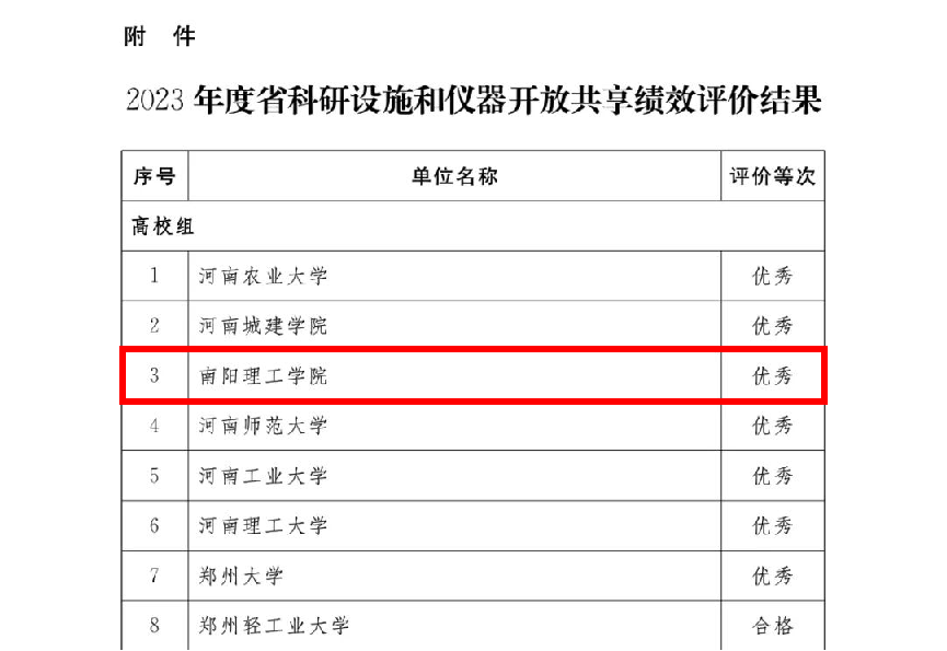 本网讯(特约记者/邹军燕)近日,河南省科技厅、财政厅、教育厅联合发文,我校在2023年度省科研设施和仪器开放共享绩效评价考核工作中获得优秀。此次参加省大仪绩效考核的高校、科研院所等共有104家单位,其中15家单位获得优秀。